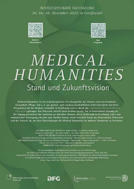 Veranstalter: Die Tagung wird vom Greifswalder Netzwerk Medical Humanities in Kooperation mit dem Department für Ethik, Theorie und Geschichte der Lebenswissenschaften (DETGELWI) der Universitätsmedizin Greifswald und dem Alfried Krupp Wissenschaftskolleg organisiert. Gefördert wird die Tagung von der Alfried Krupp von Bohlen und Halbach-Stiftung (Essen), der DFG und dem DETGELWI.